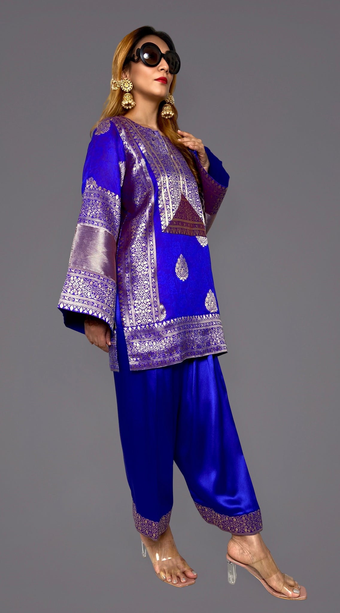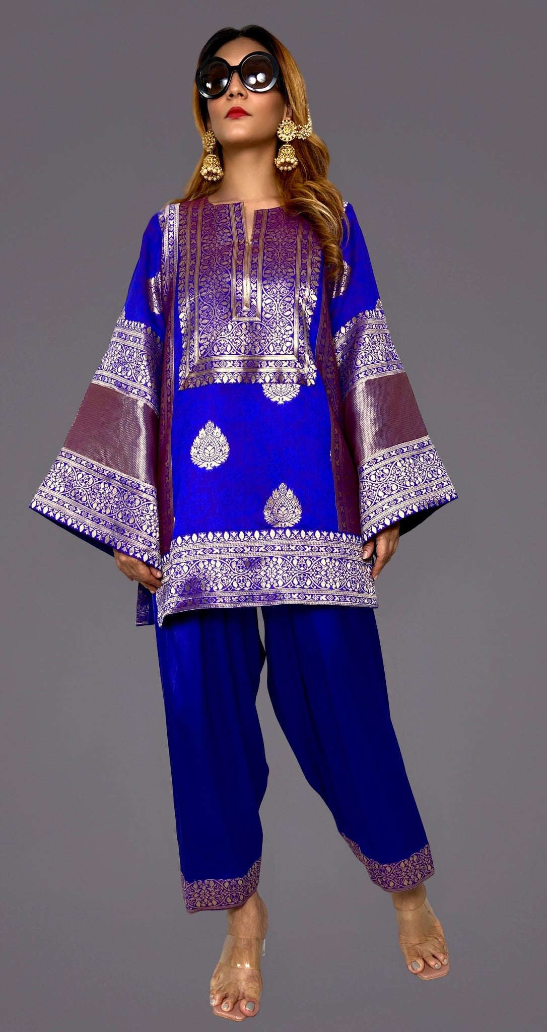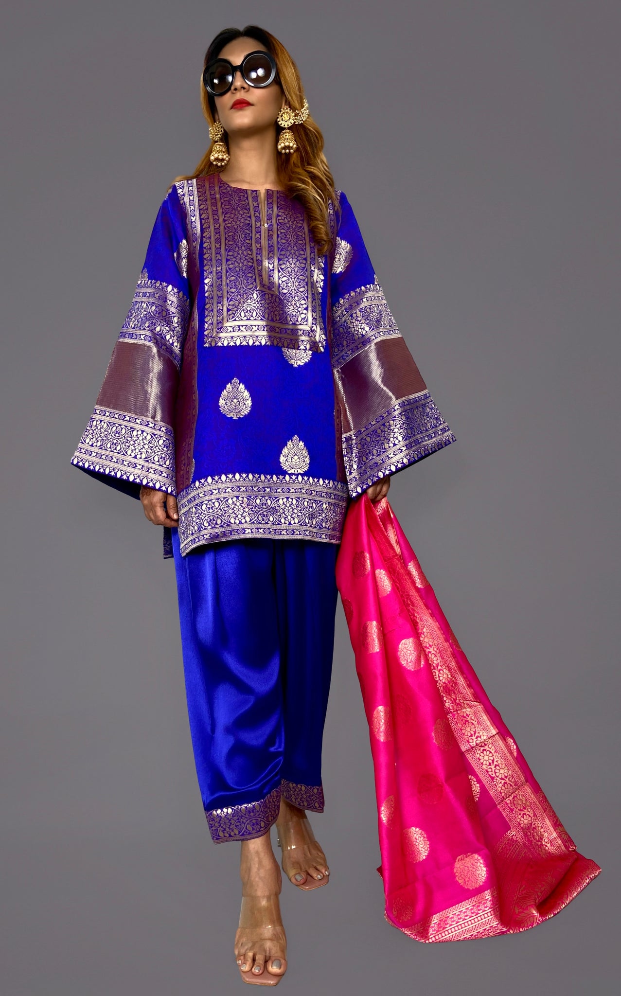 Our woven banarasi silk Kameez- Shalwar Dupatta set is sure to make heads turn this festive season.