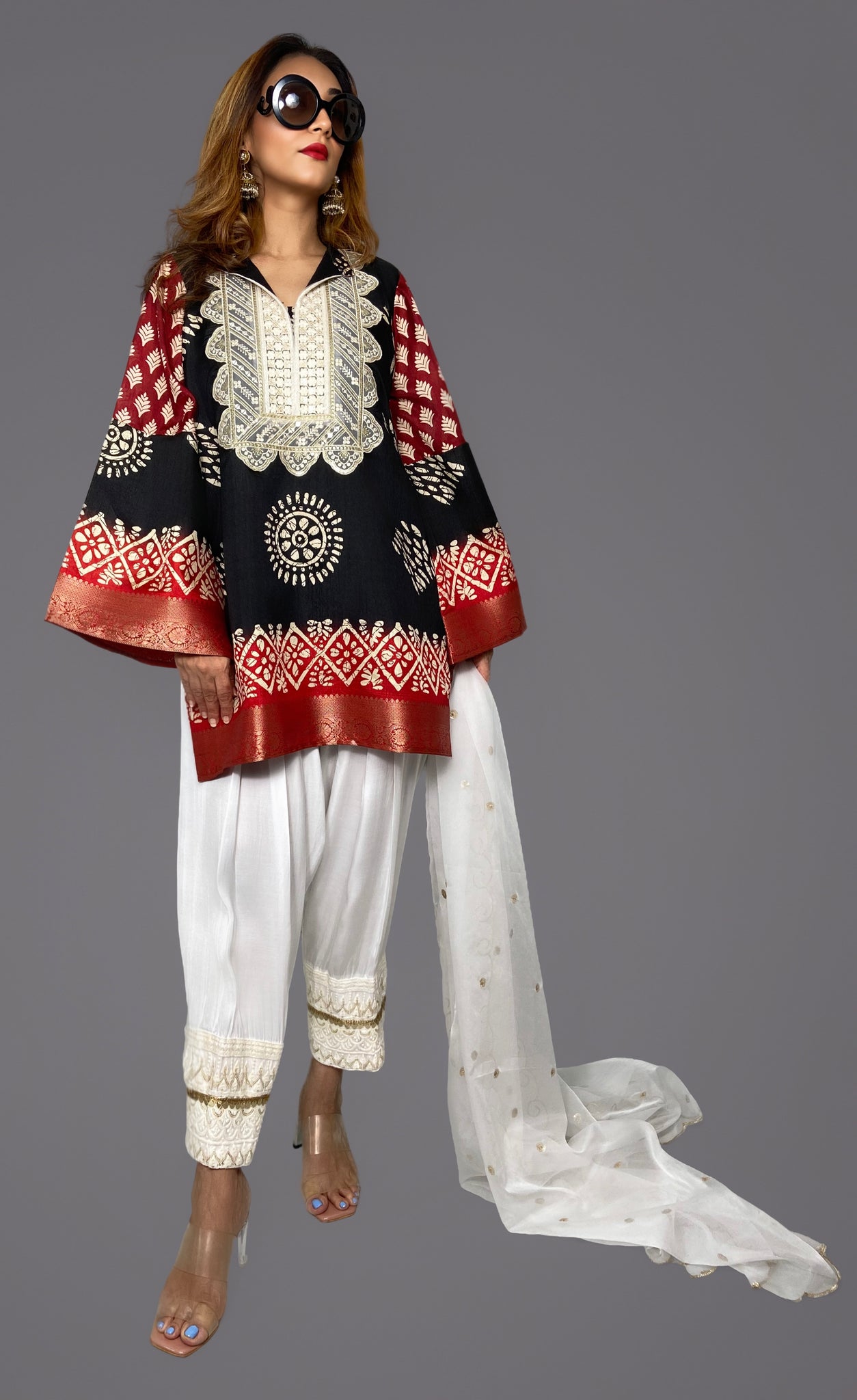 Our extremely lightweight woven crepe silk Kameez Shalwar Dupatta 3 piece set is sure to make heads turn this festive season.