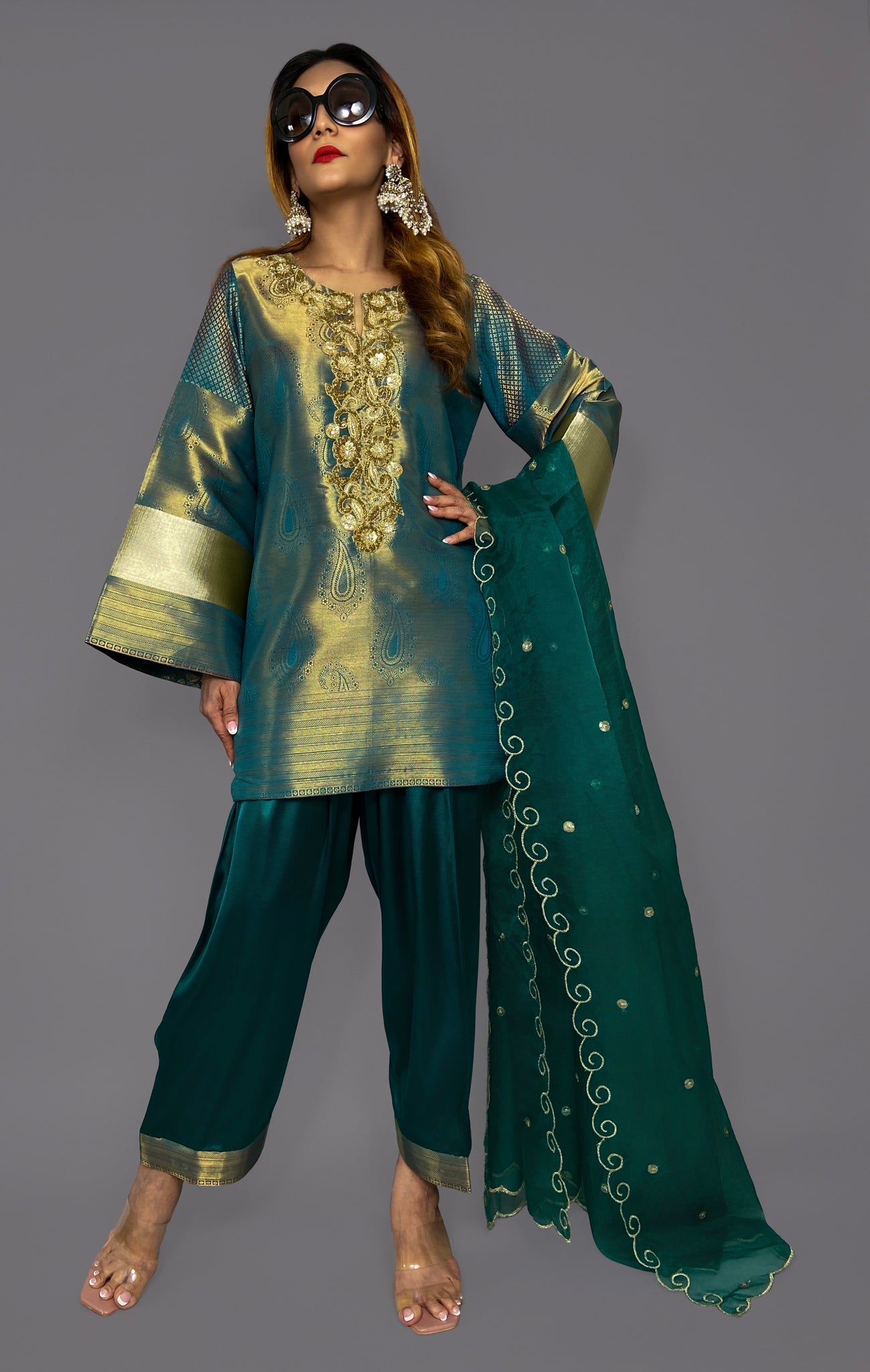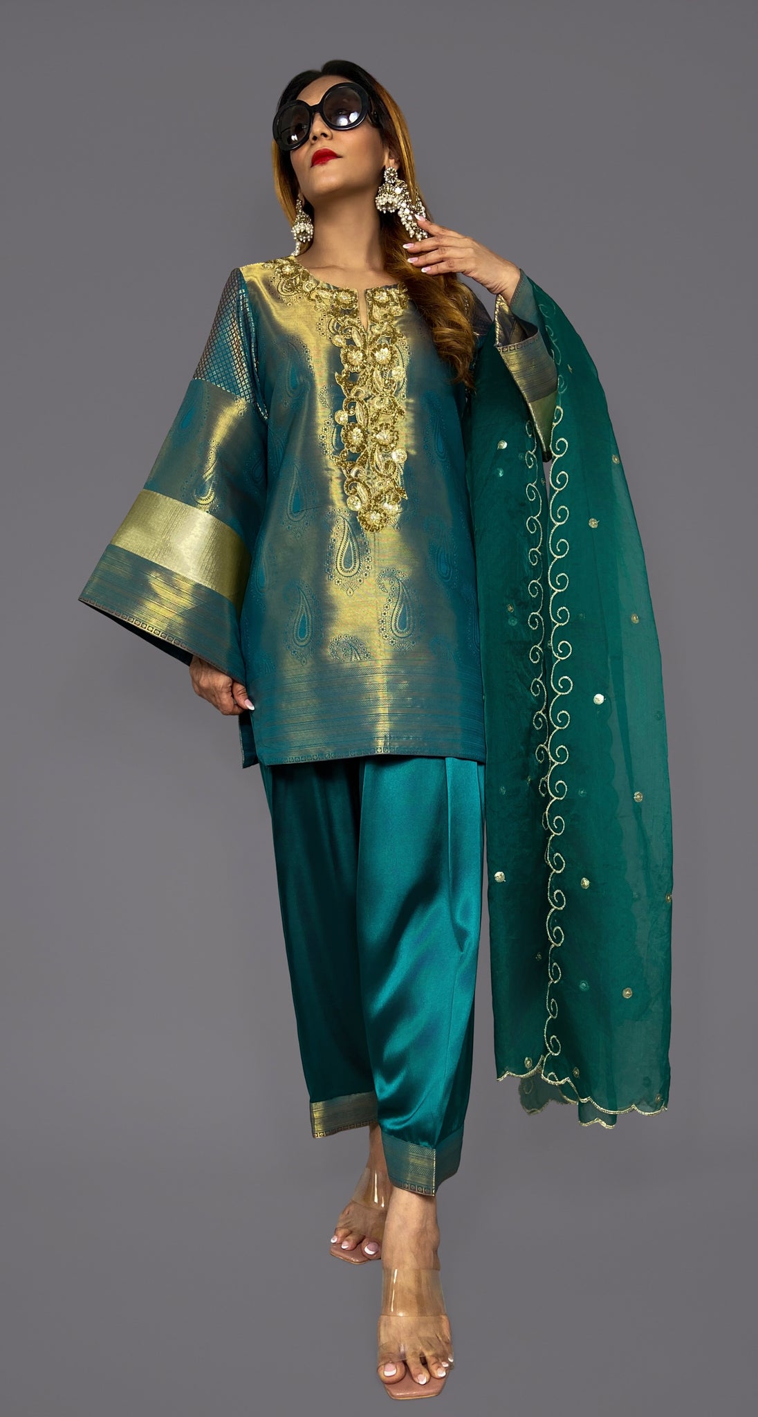 Our extremely lightweight woven brocade tissue Kameez Shalwar Dupatta 3 piece set is sure to make heads turn this festive season.