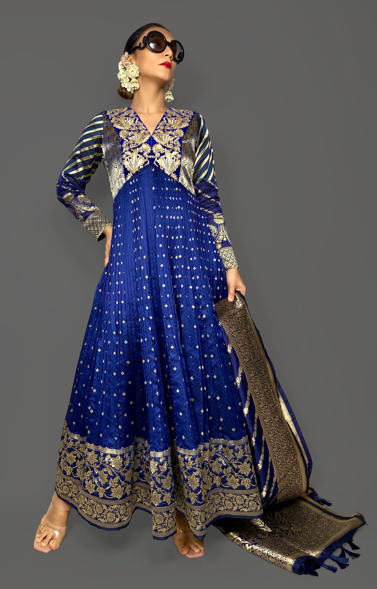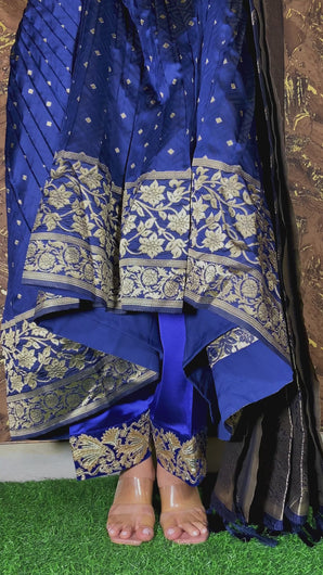 Our pleated woven banarasi silk  3 piece Anarkali suit set is sure to make heads turn this season.