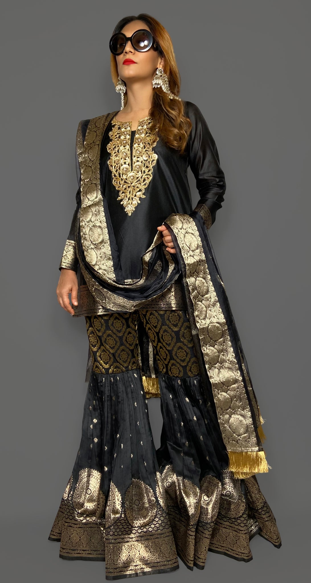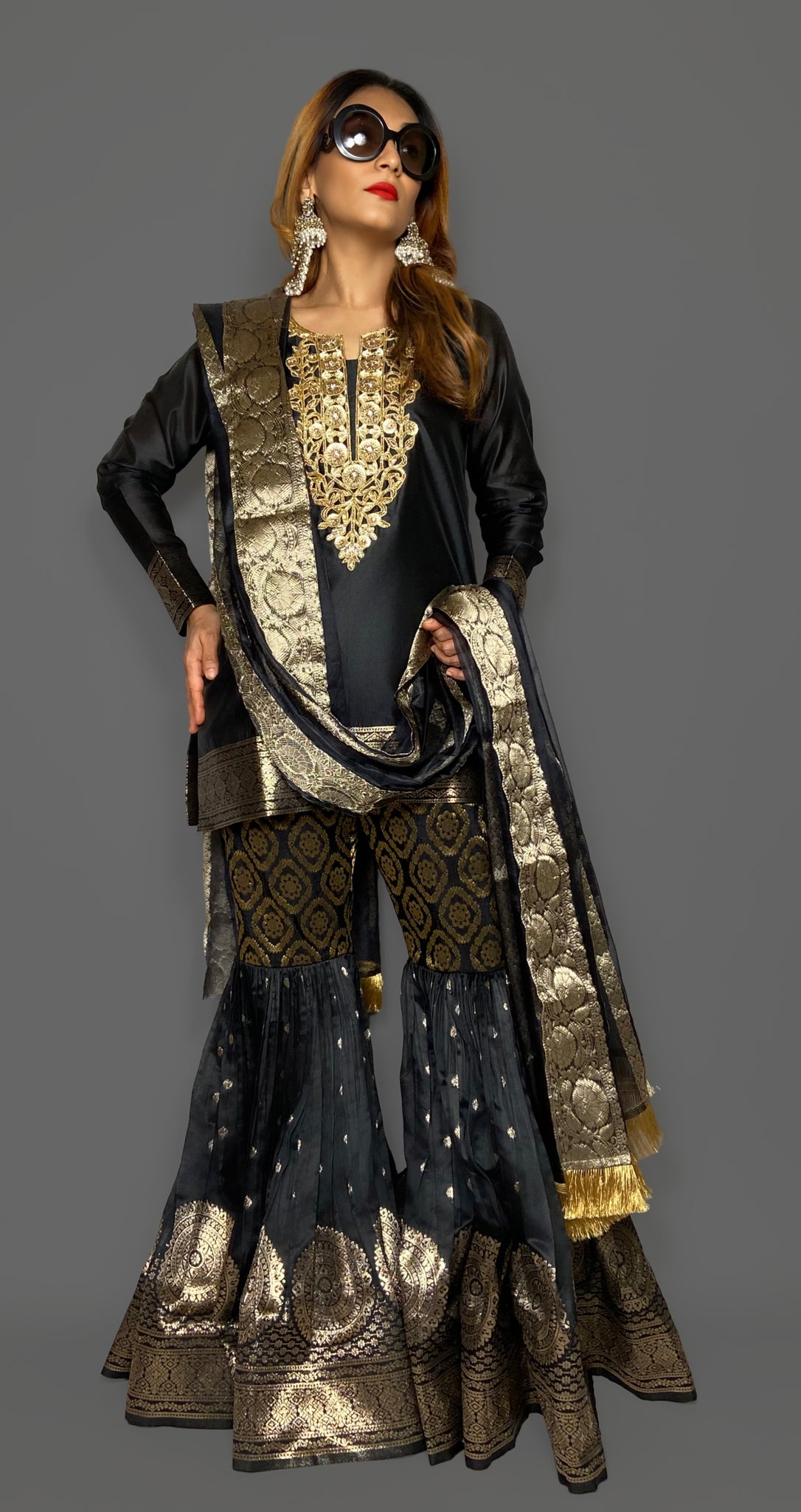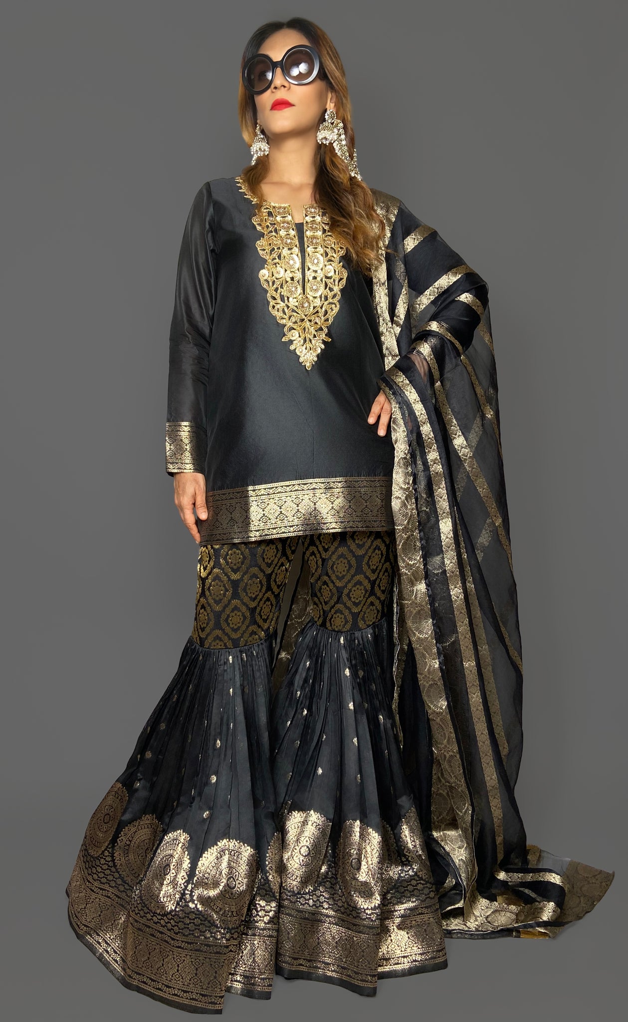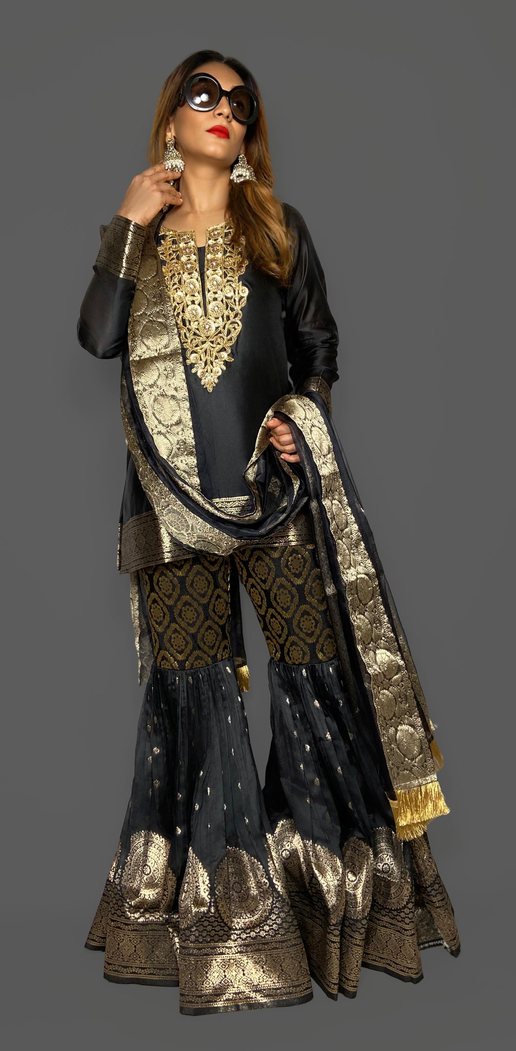 Our woven banarasi silk gharara suit set is sure to make all heads turn this festive season.