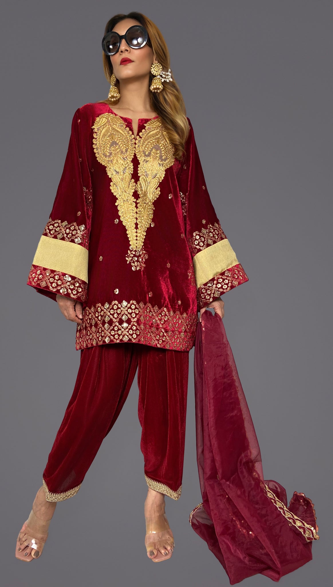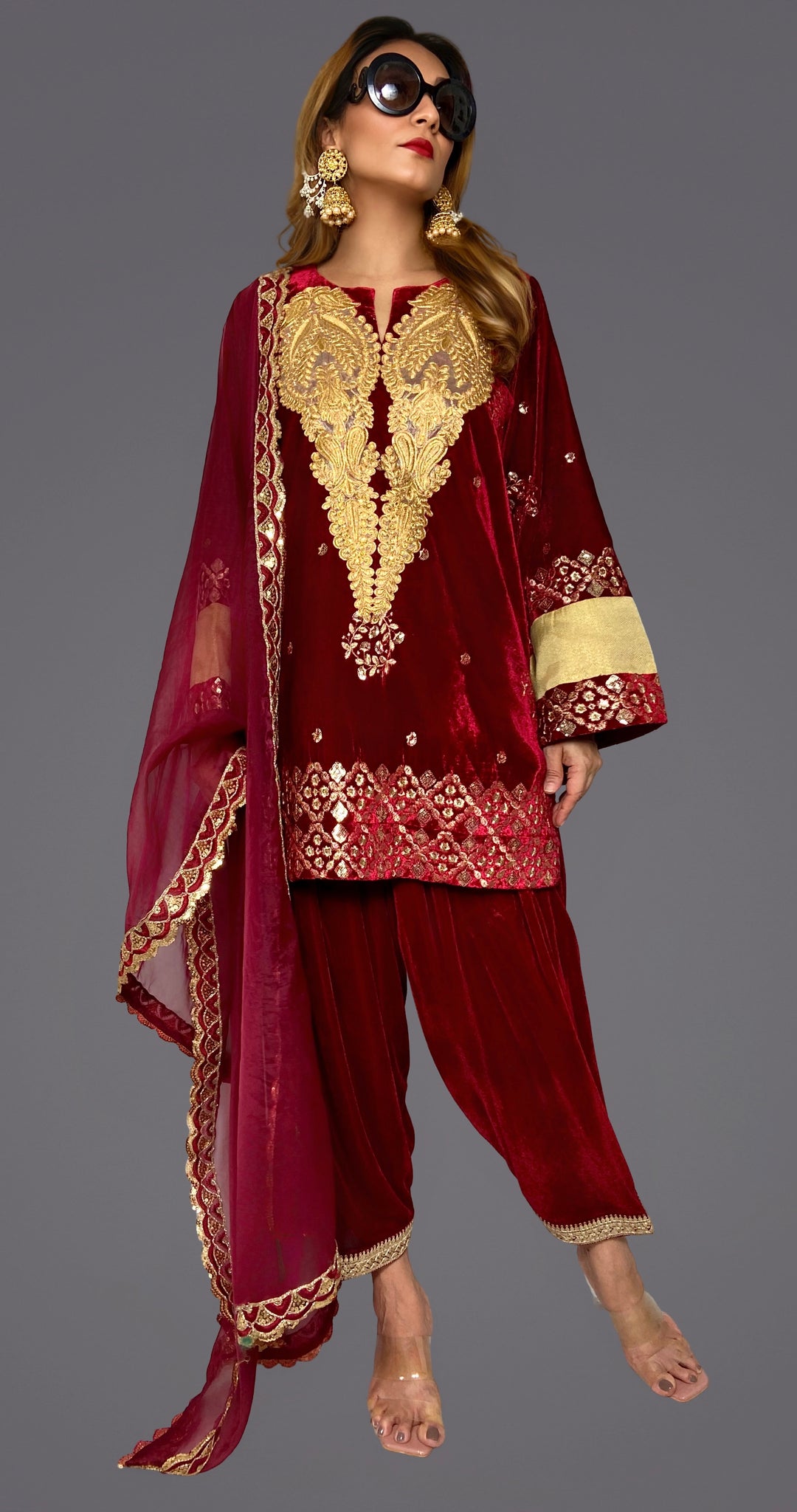 Our heavily embroidered kameez shalwar dupatta 3 piece velvet suit set is sure to make heads turn this season.