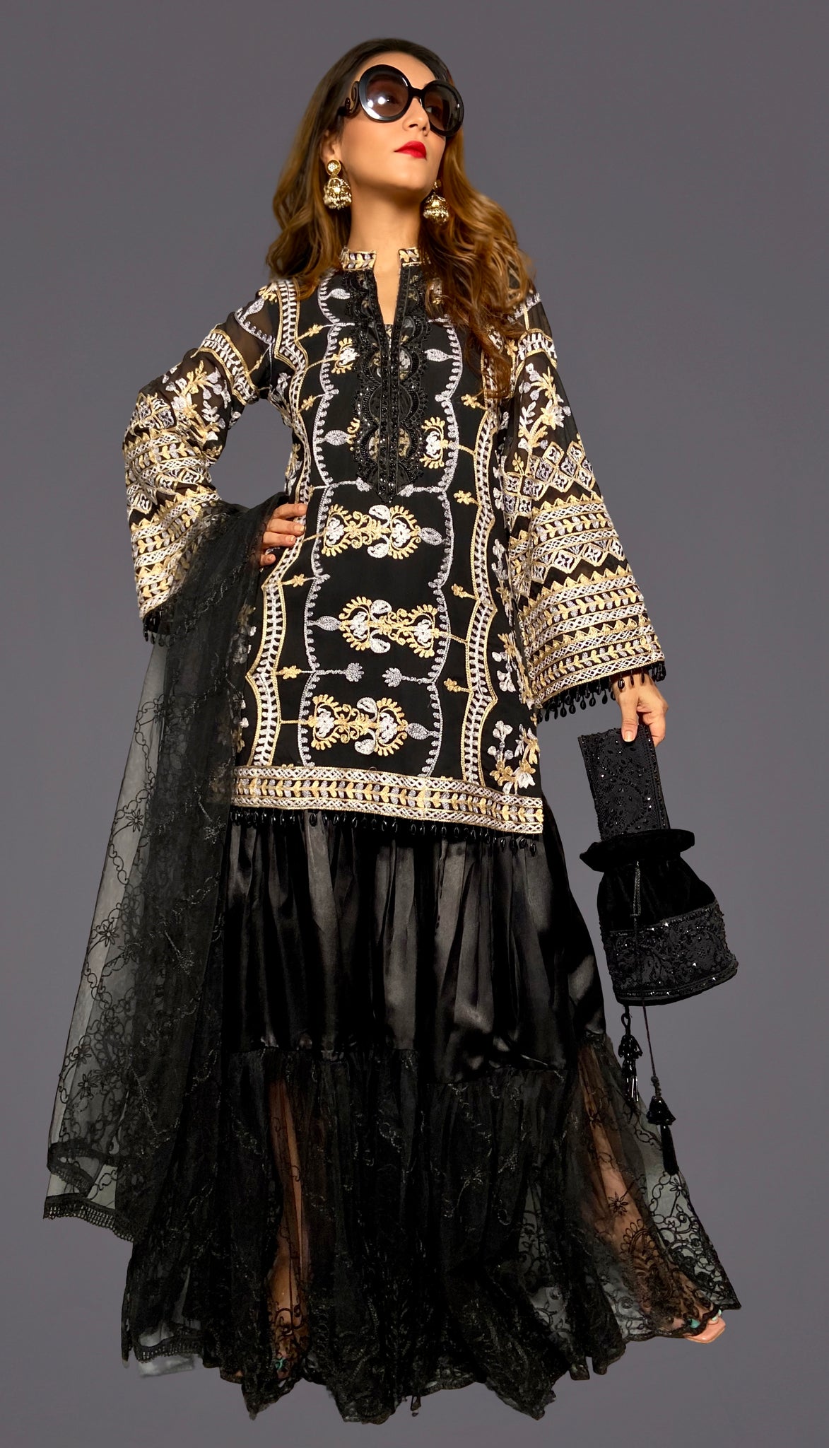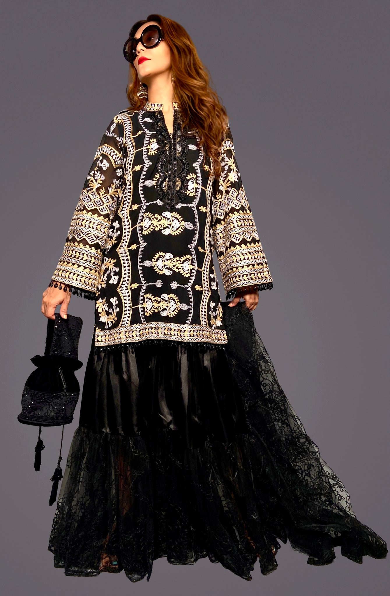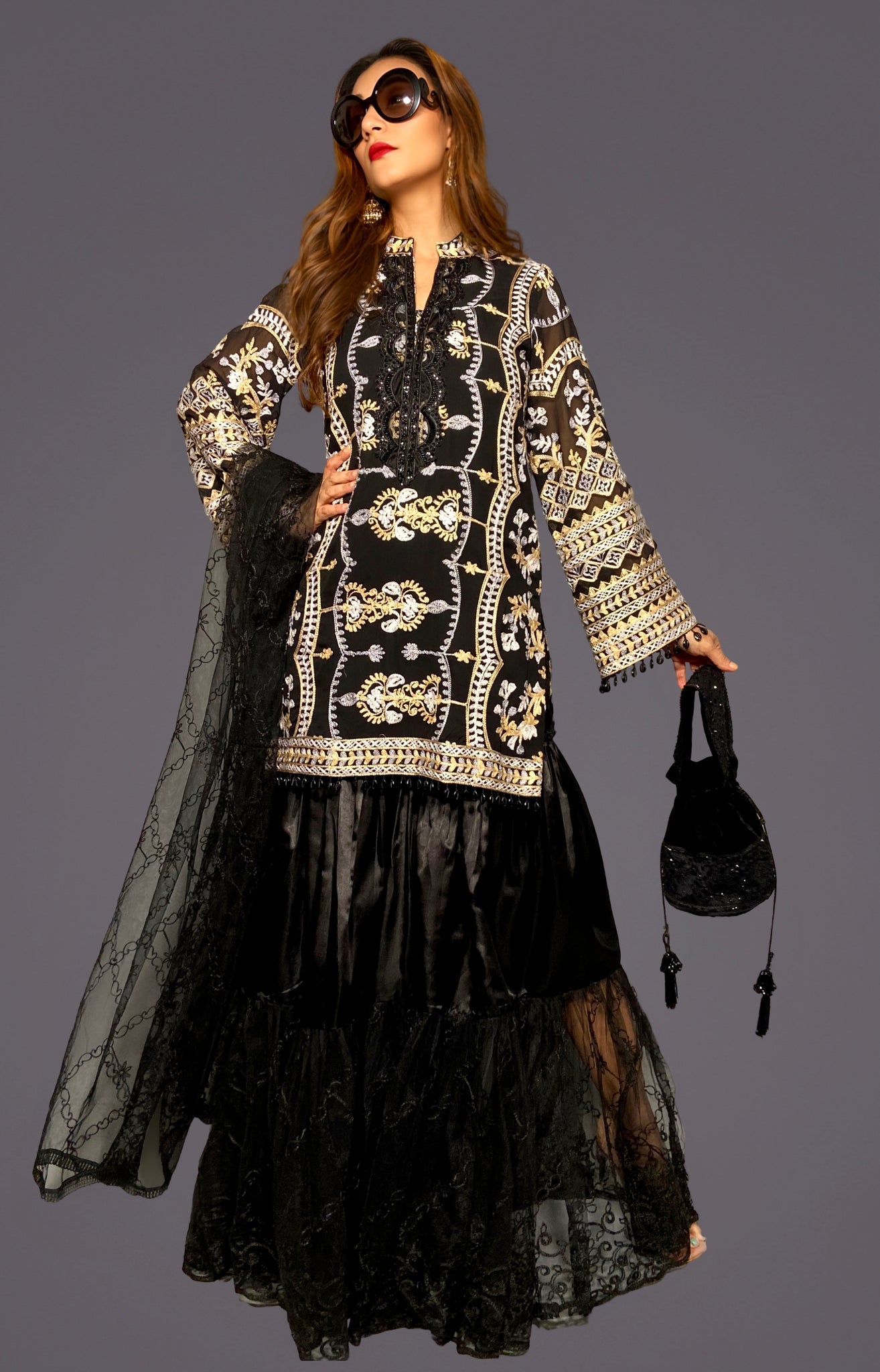 AHLAM Our extremely lightweight front and back heavily embroidered Kameez-Gharara-Dupatta suit set is sure to make heads turn this season.