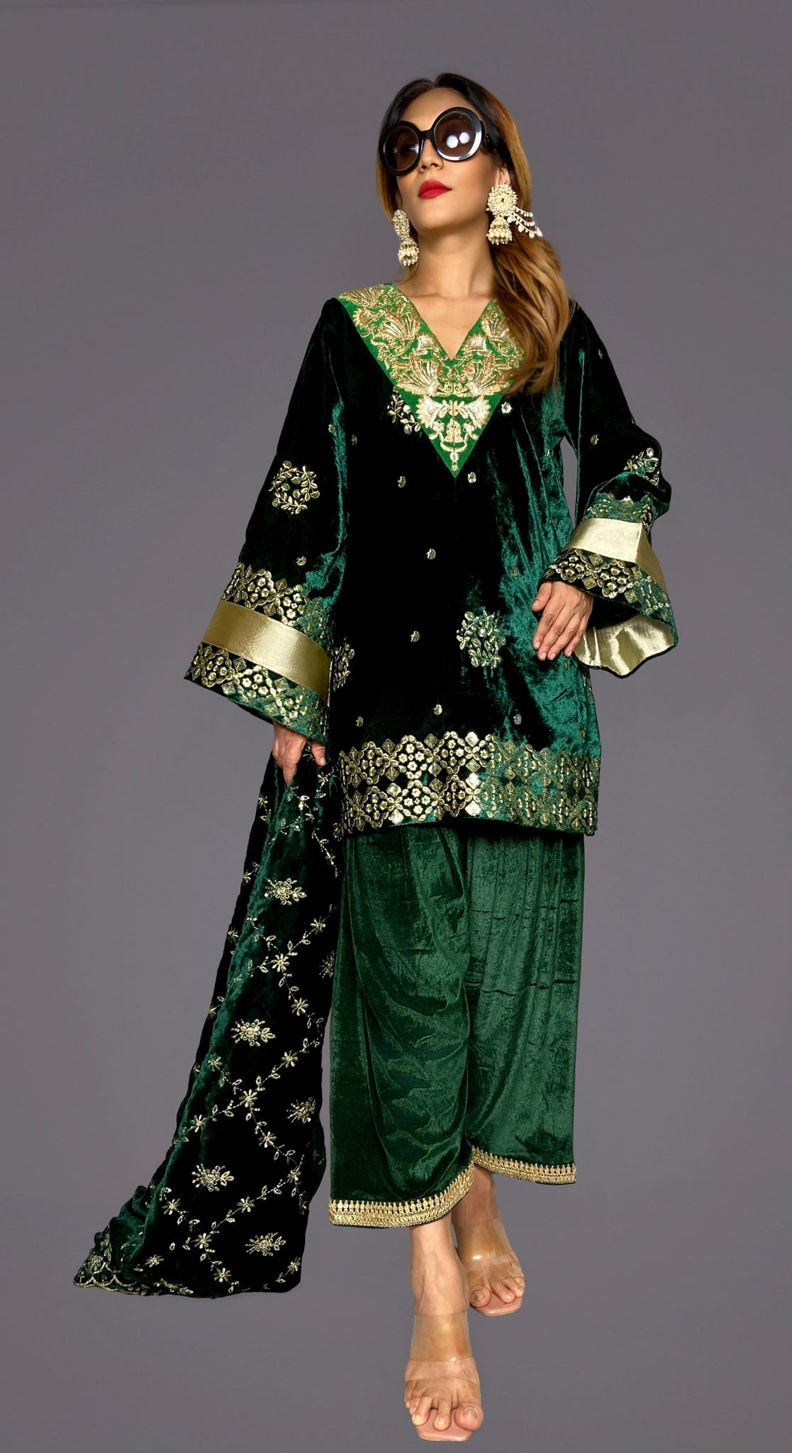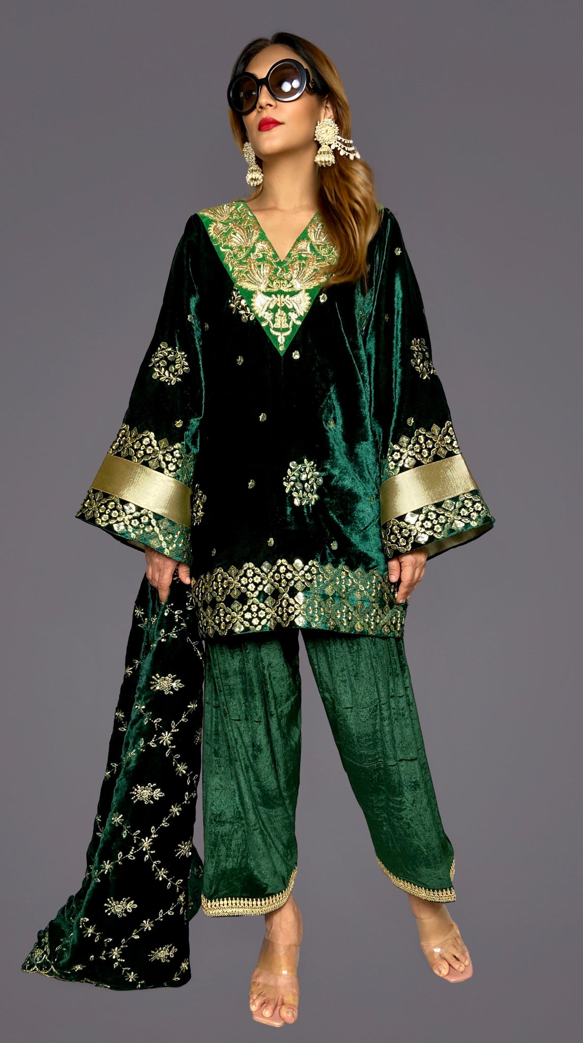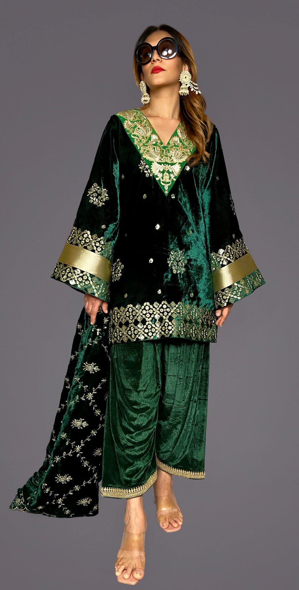 Our heavily embroidered kameez shalwar dupatta 3 piece velvet suit set is sure to make heads turn this season.