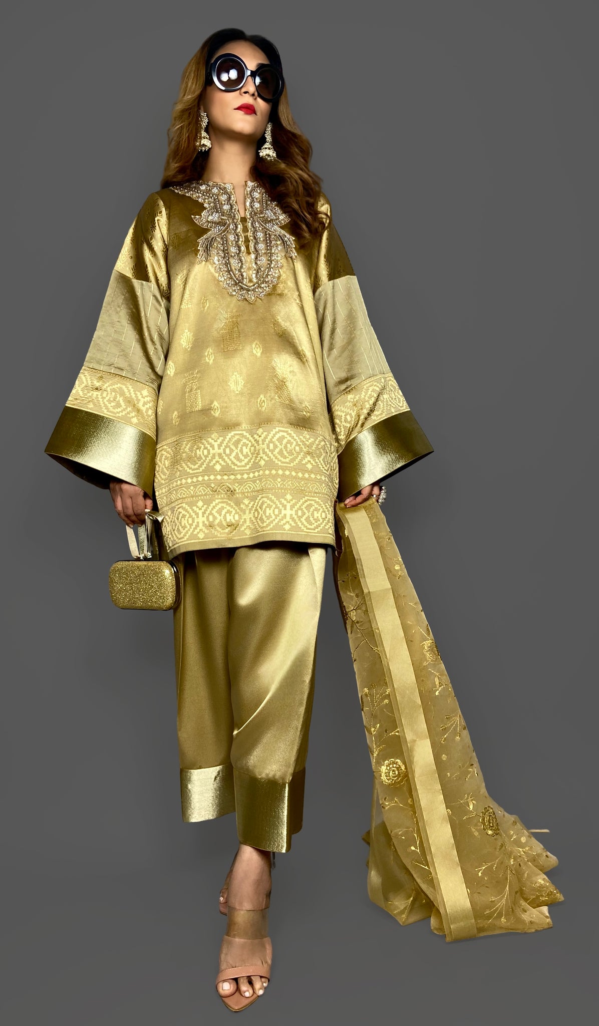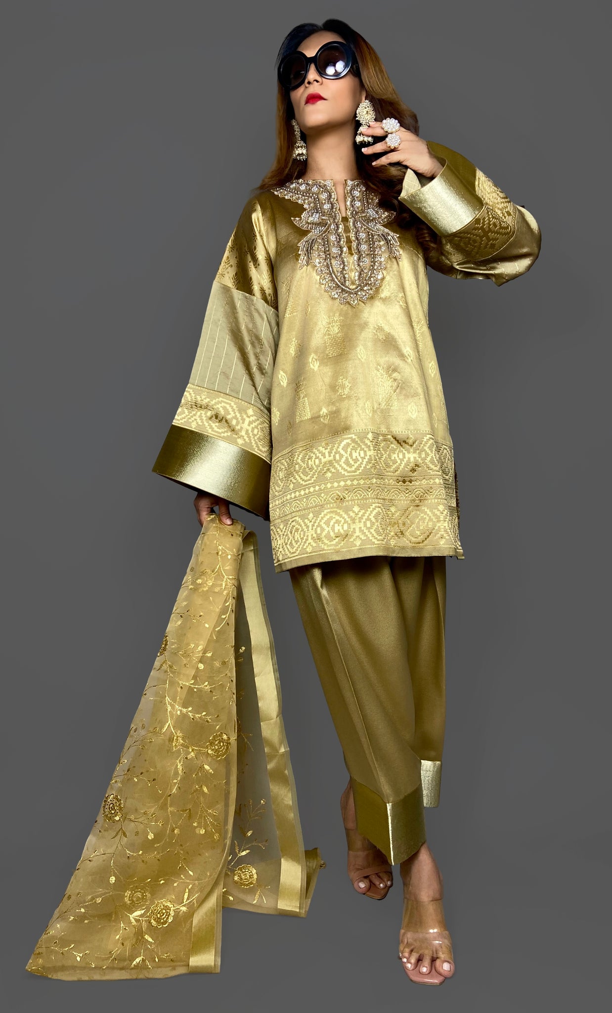 Our extremely lightweight woven brocade Kameez Shalwar Dupatta 3 piece set is sure to make heads turn this festive season.