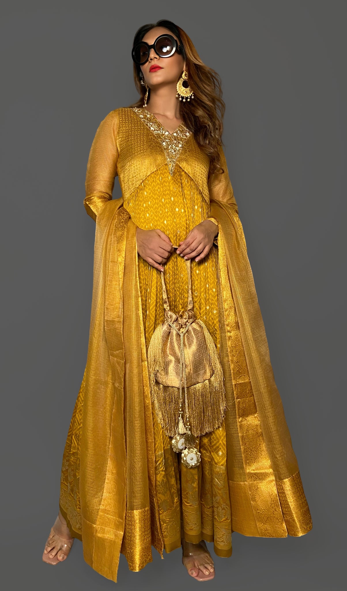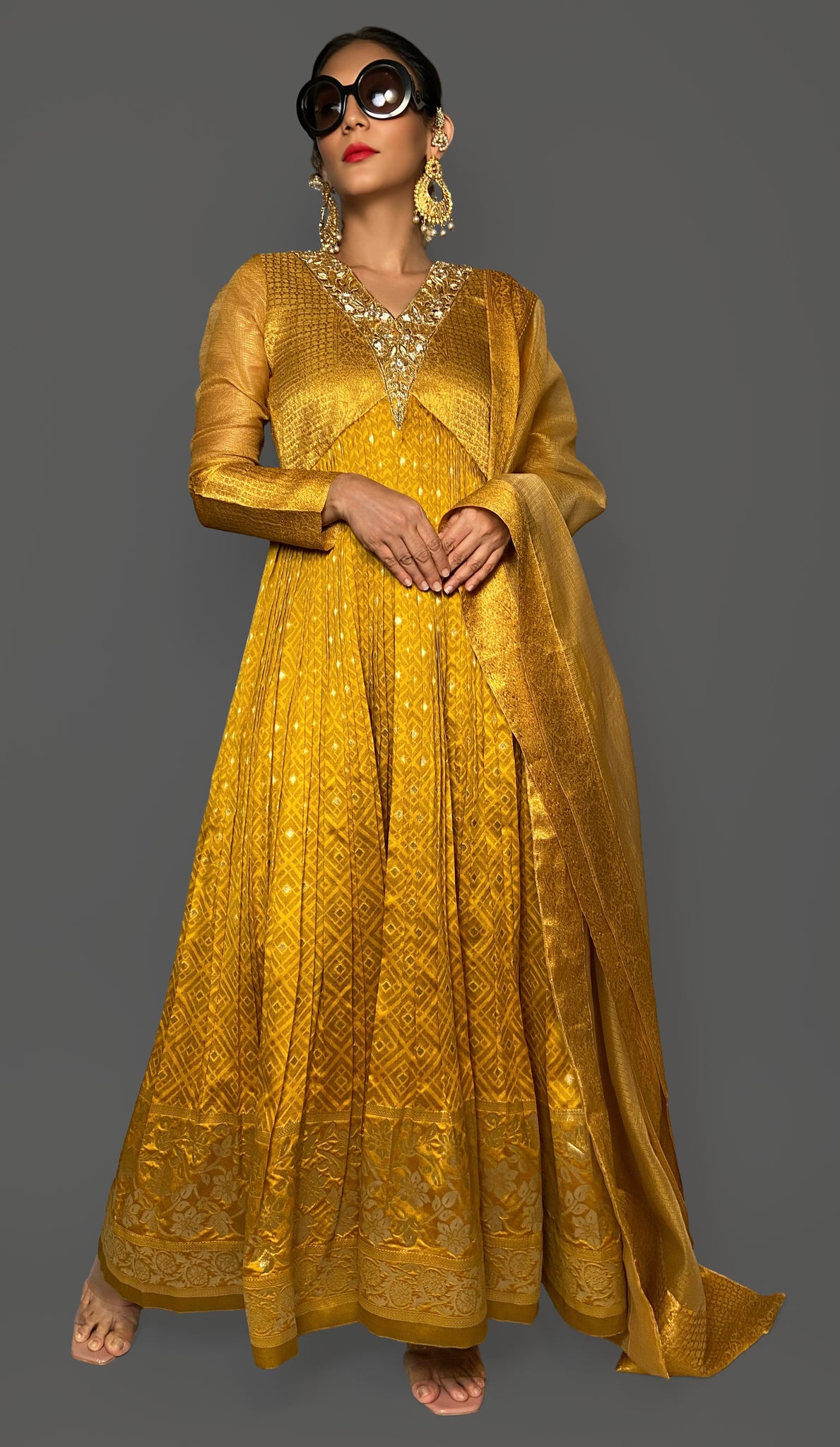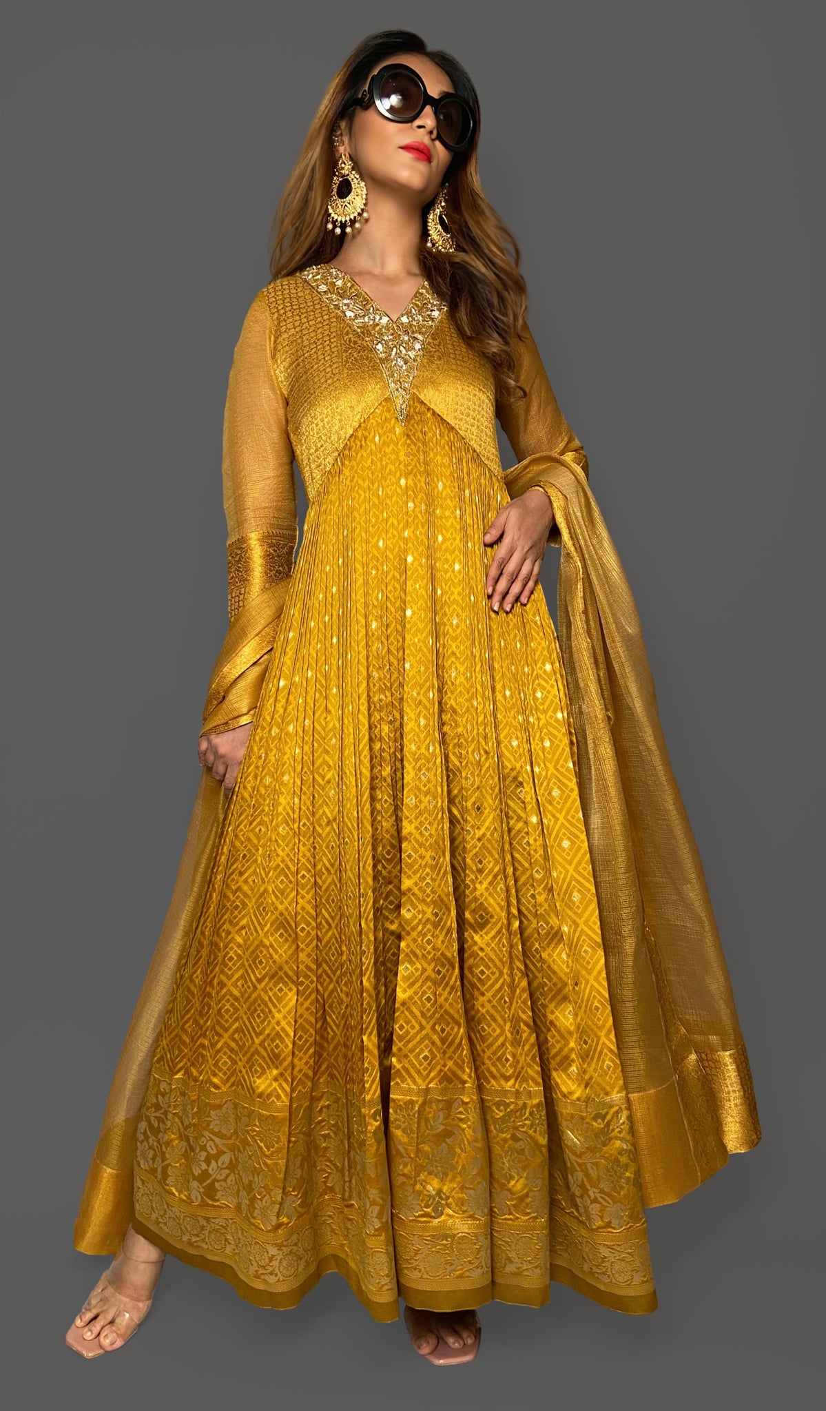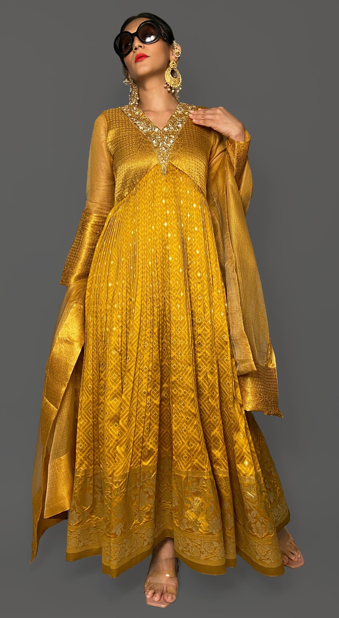 Our woven banarasi silk 3 piece Anarkali suit set is sure to make heads turn this season.